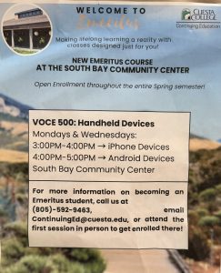 Please join us in the Handheld device class offered for free by Cuesta College’s Emeritus program. We will have classes for Android and Apple devices on Mondays and Wednesdays 3-4 for Apple devices and 4-5 for Android devices. See you there!